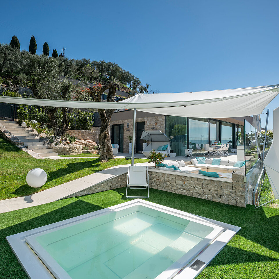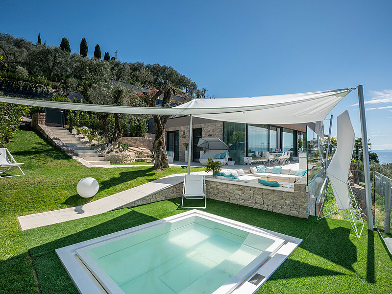 Gli eleganti edifici sono armoniosamente integrati nel paesaggio. Le pareti in pietra naturale locale sottolineano il fascino mediterraneo di un'architettura moderna e senza tempo. Le generose finestre rendono gli ambienti luminosi e permettono di godere di una vista senza ostacoli su uno dei laghi più belli d'Italia.
