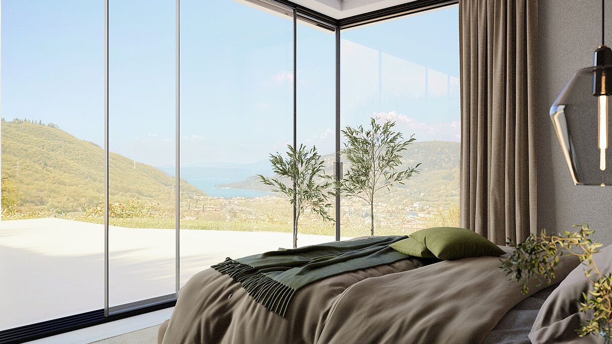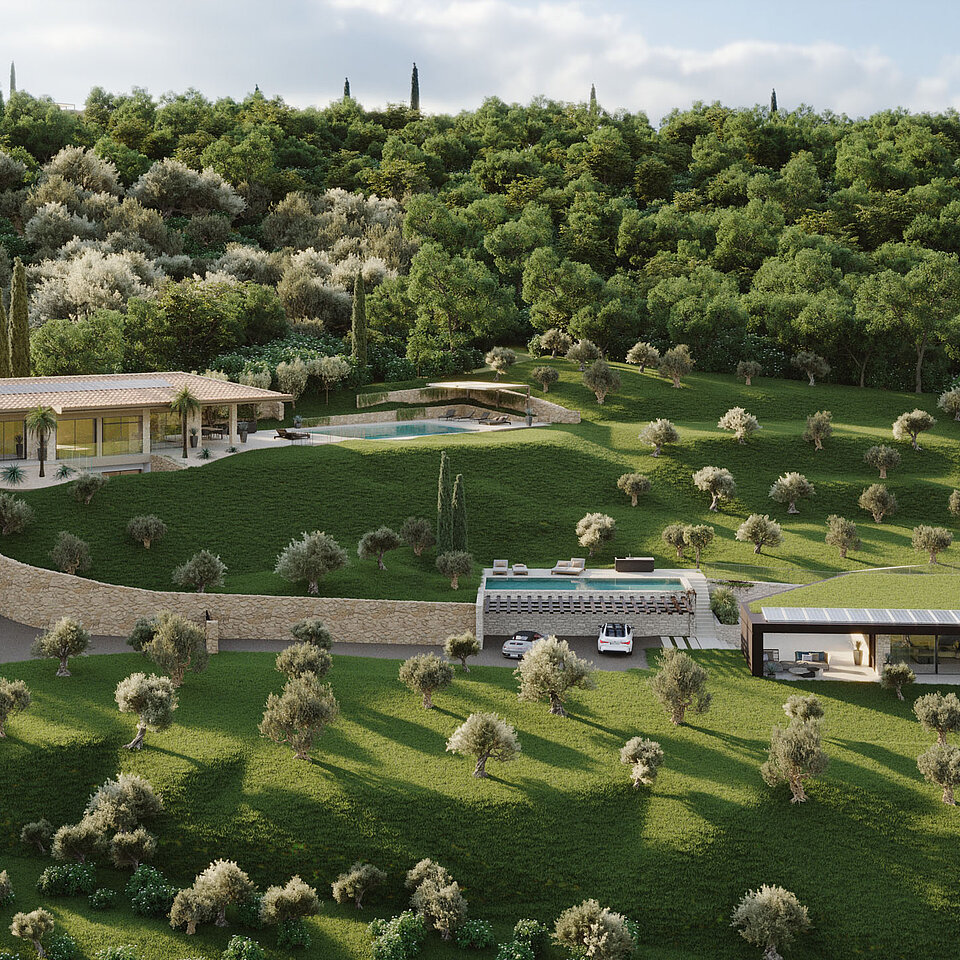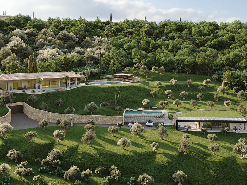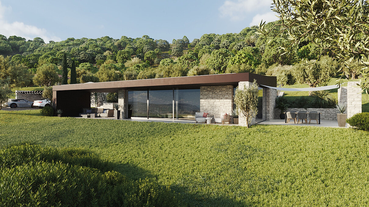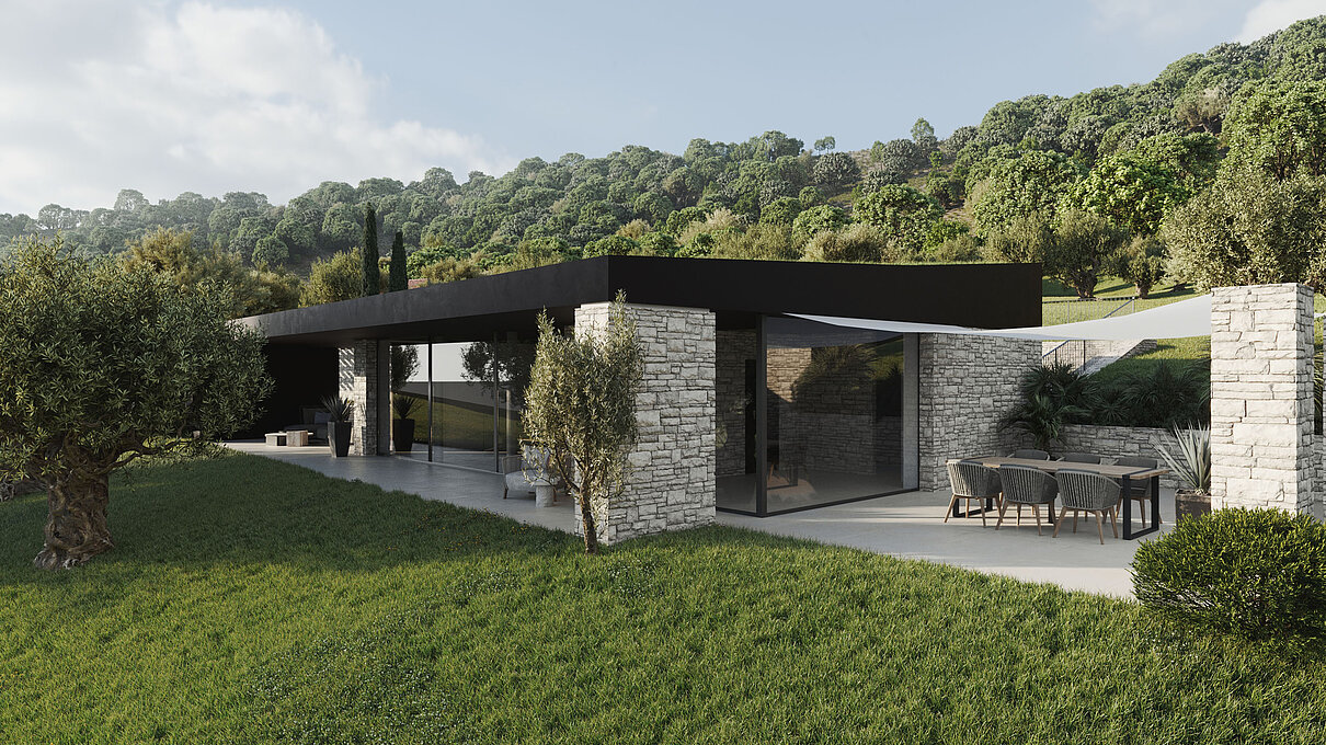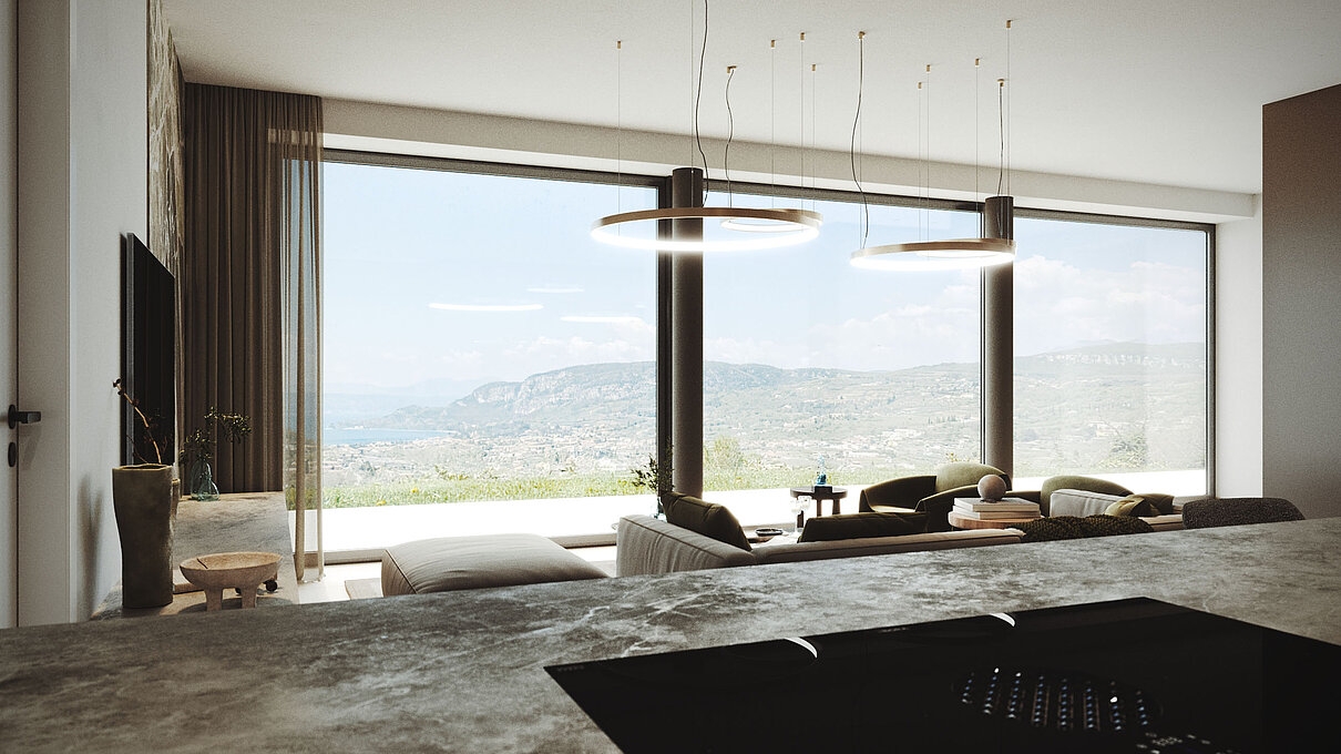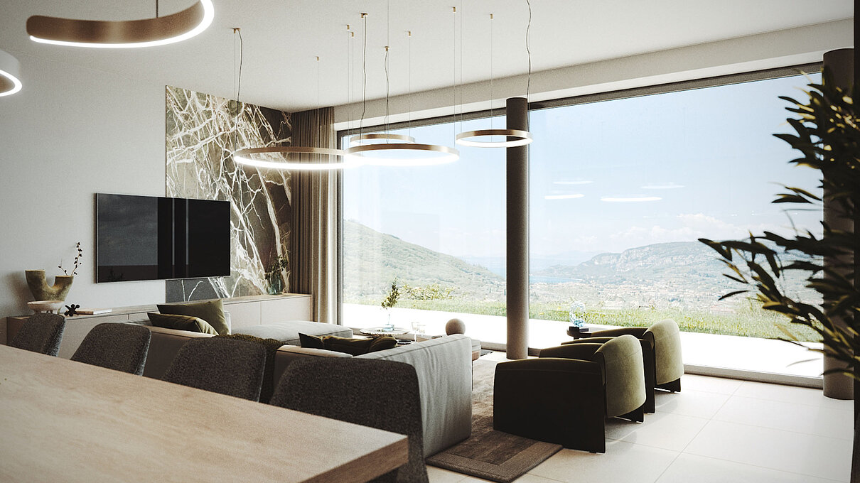 Le eleganti strutture si integrano armoniosamente nel paesaggio. I muri in pietra naturale tipici della zona esaltano il fascino mediterraneo dell'architettura moderna e senza tempo. Ampie superfici vetrate aprono gli spazi luminosi verso l'esterno e offrono una vista libera sul lago più bello d'Italia.