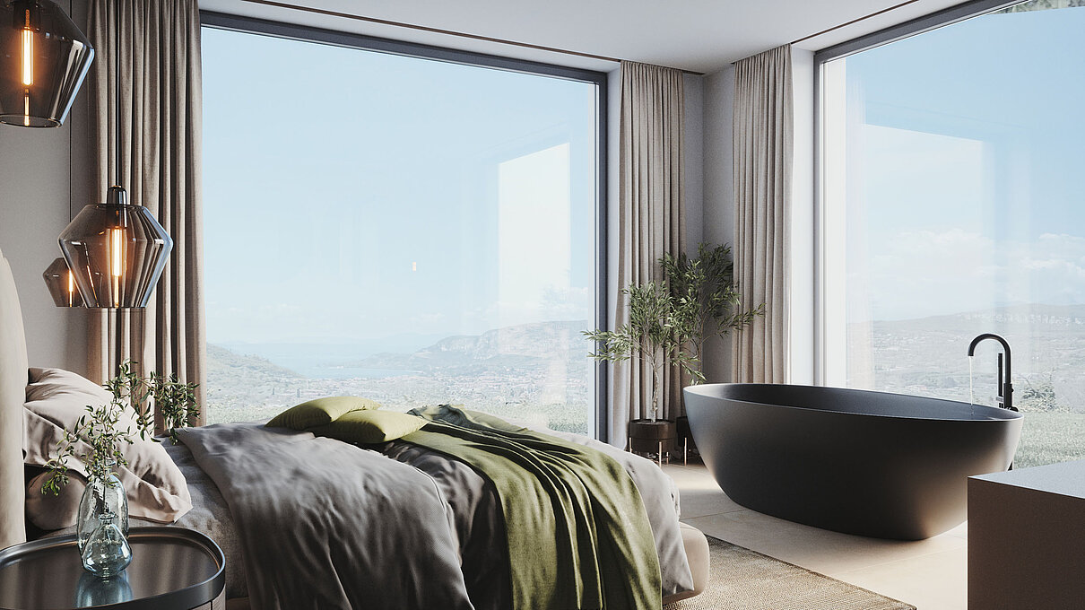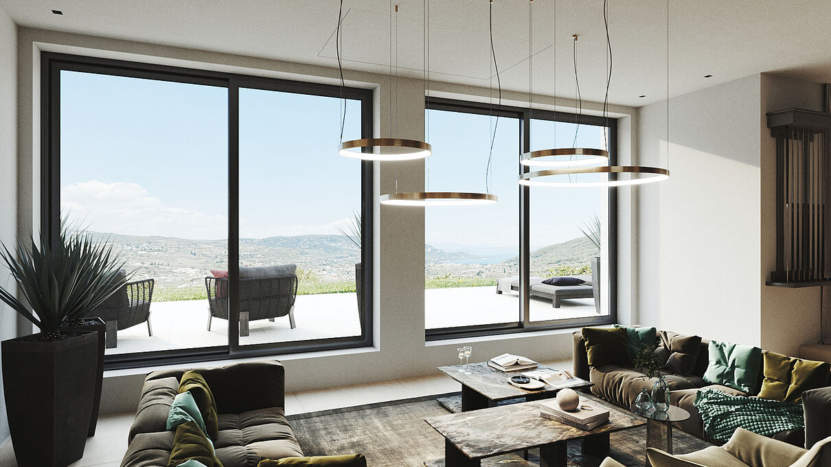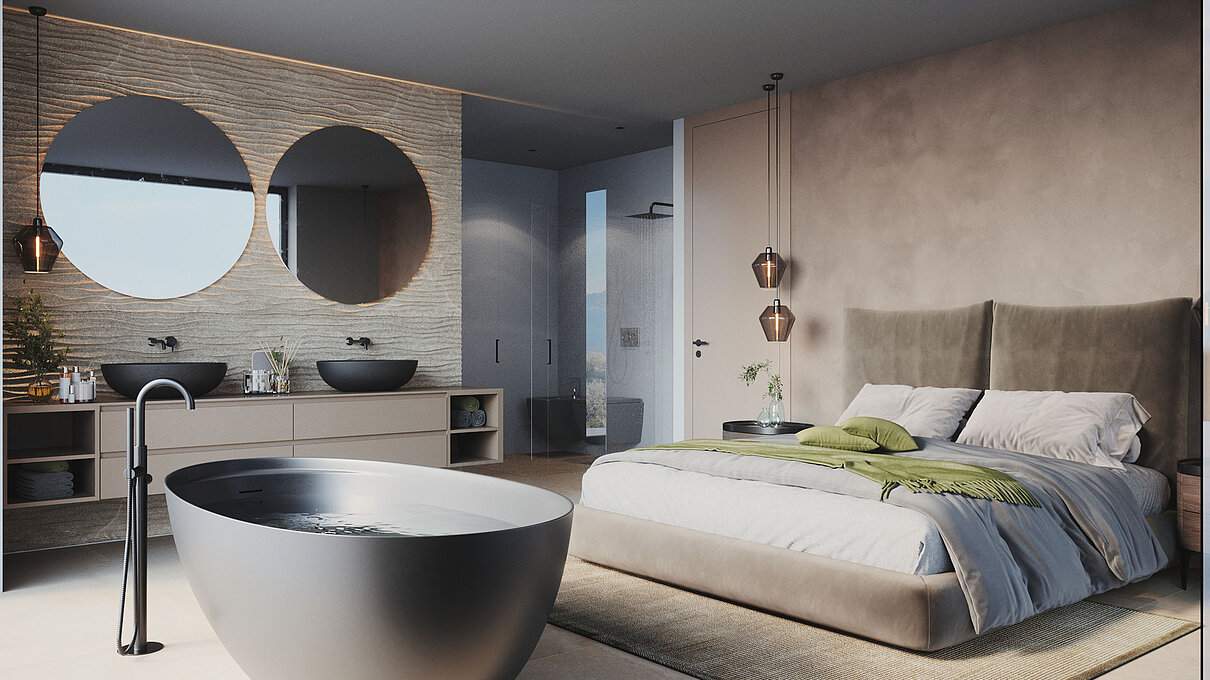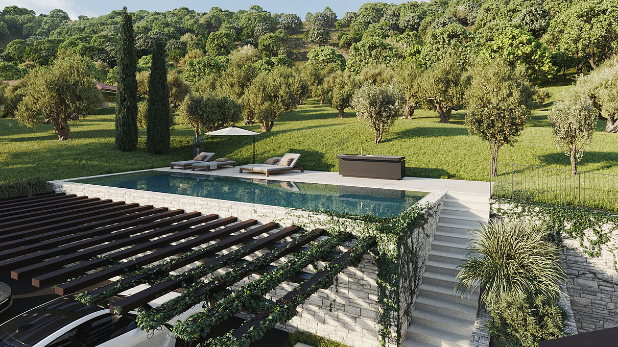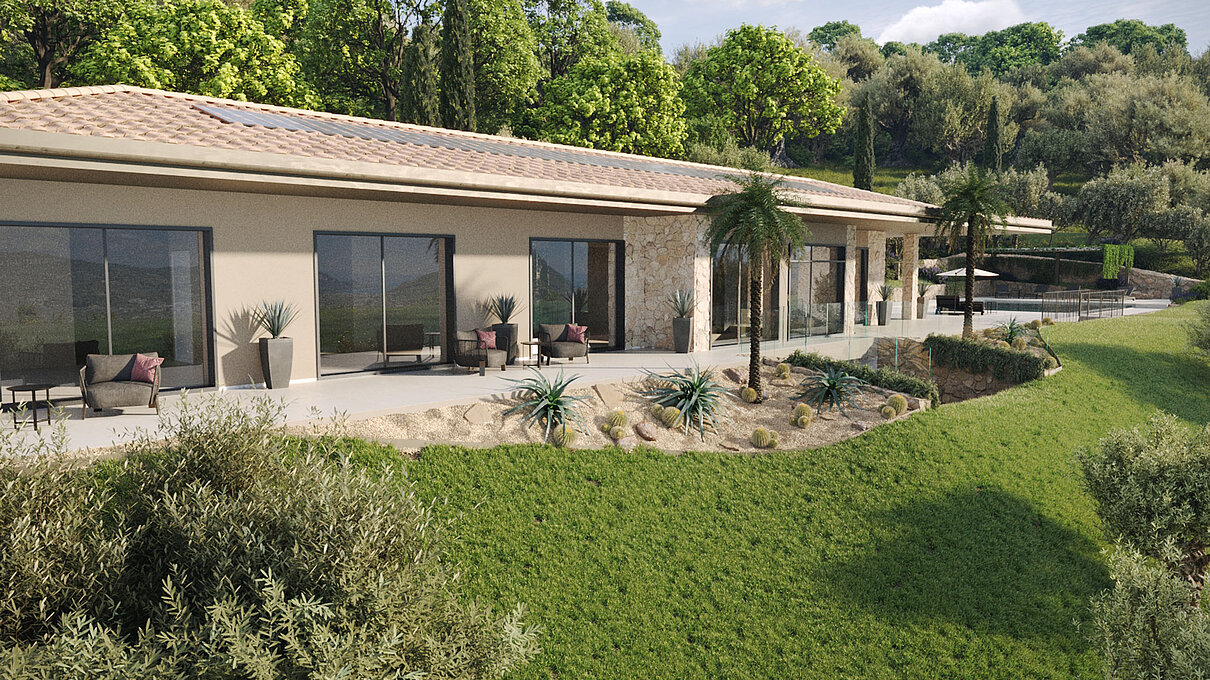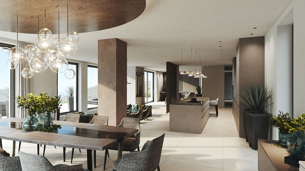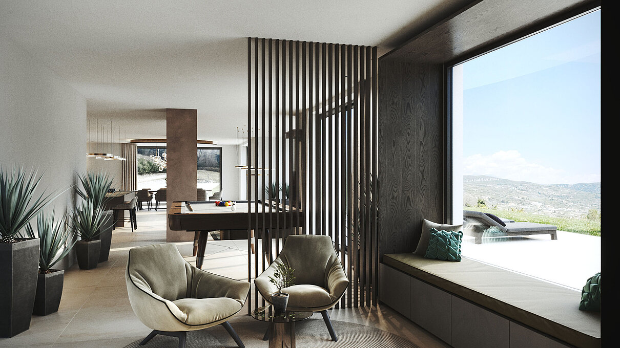 Le eleganti strutture si integrano armoniosamente nel paesaggio. I muri in pietra naturale tipici della zona esaltano il fascino mediterraneo dell'architettura moderna e senza tempo. Ampie superfici vetrate aprono gli spazi luminosi verso l'esterno e offrono una vista libera sul lago più bello d'Italia.