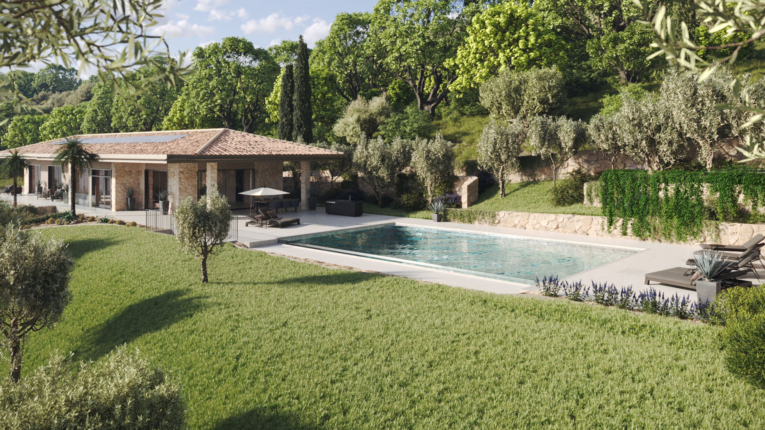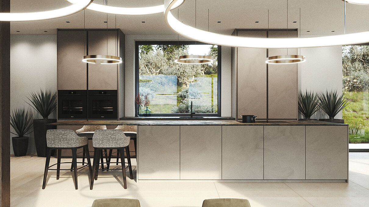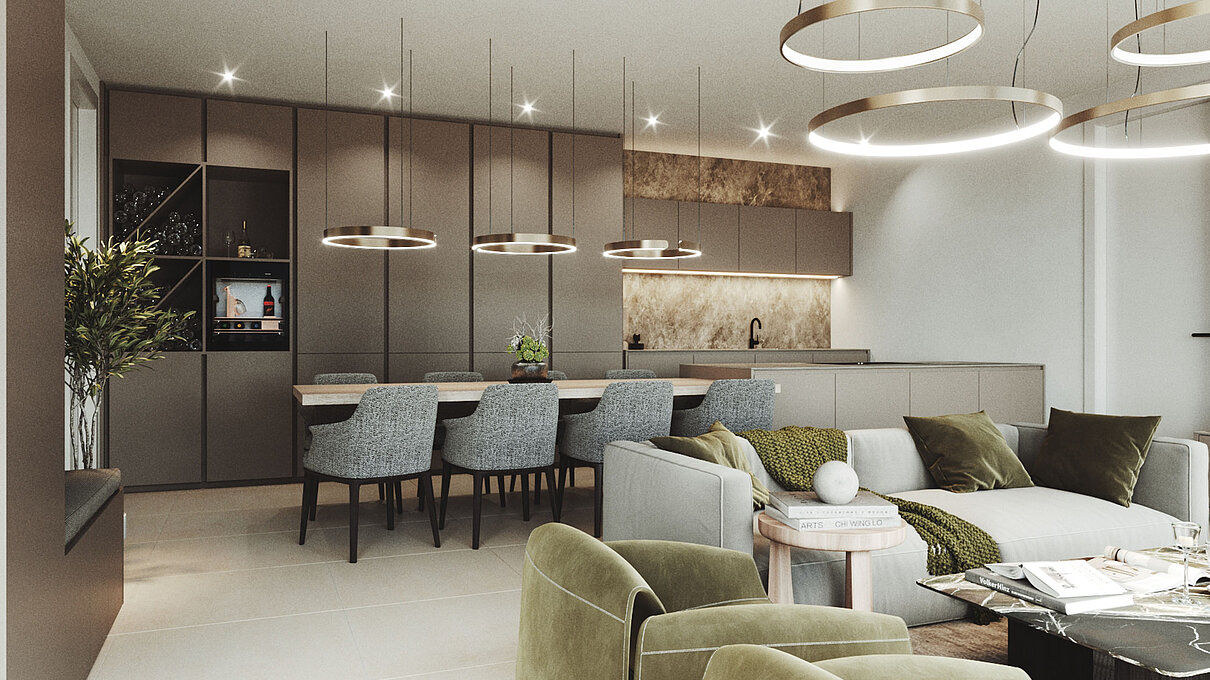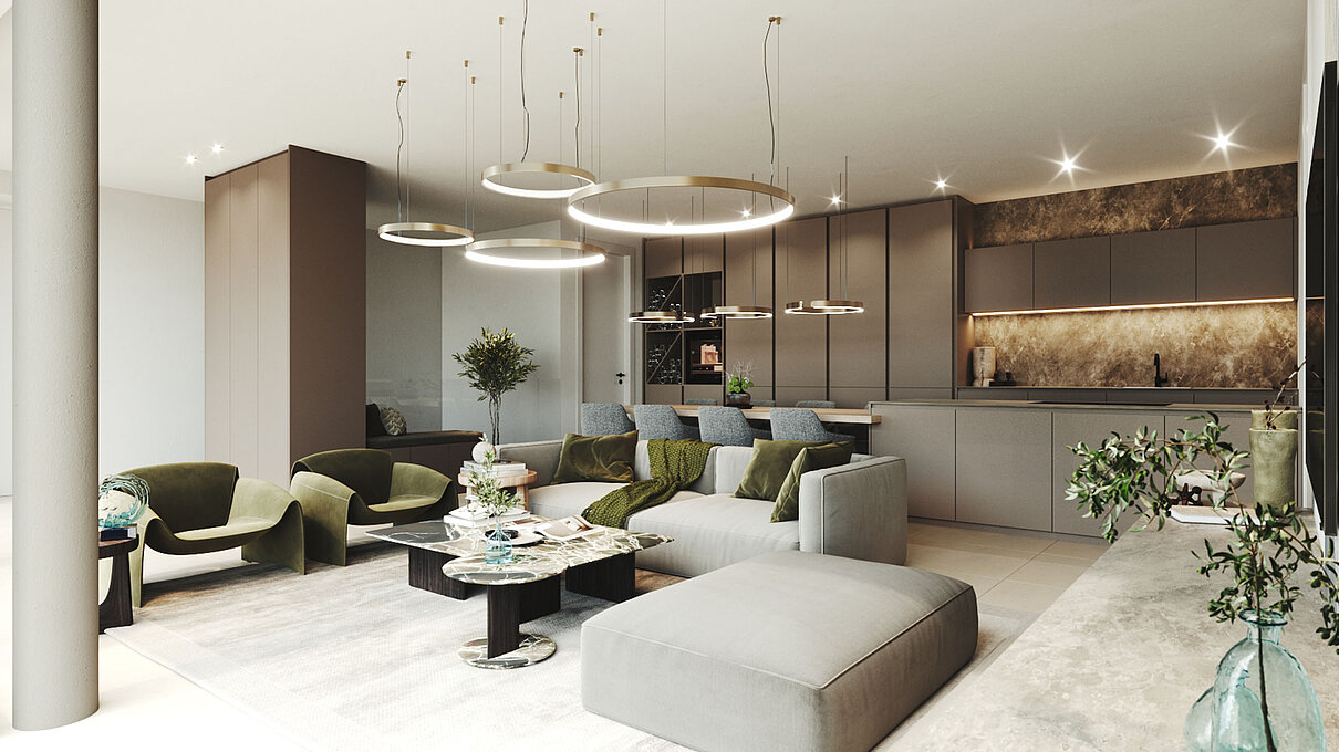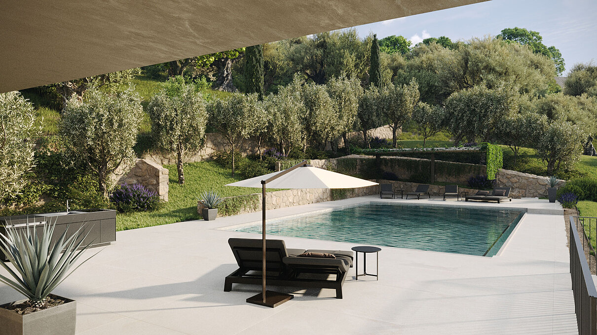 Le eleganti strutture si integrano armoniosamente nel paesaggio. I muri in pietra naturale tipici della zona esaltano il fascino mediterraneo dell'architettura moderna e senza tempo. Ampie superfici vetrate aprono gli spazi luminosi verso l'esterno e offrono una vista libera sul lago più bello d'Italia.