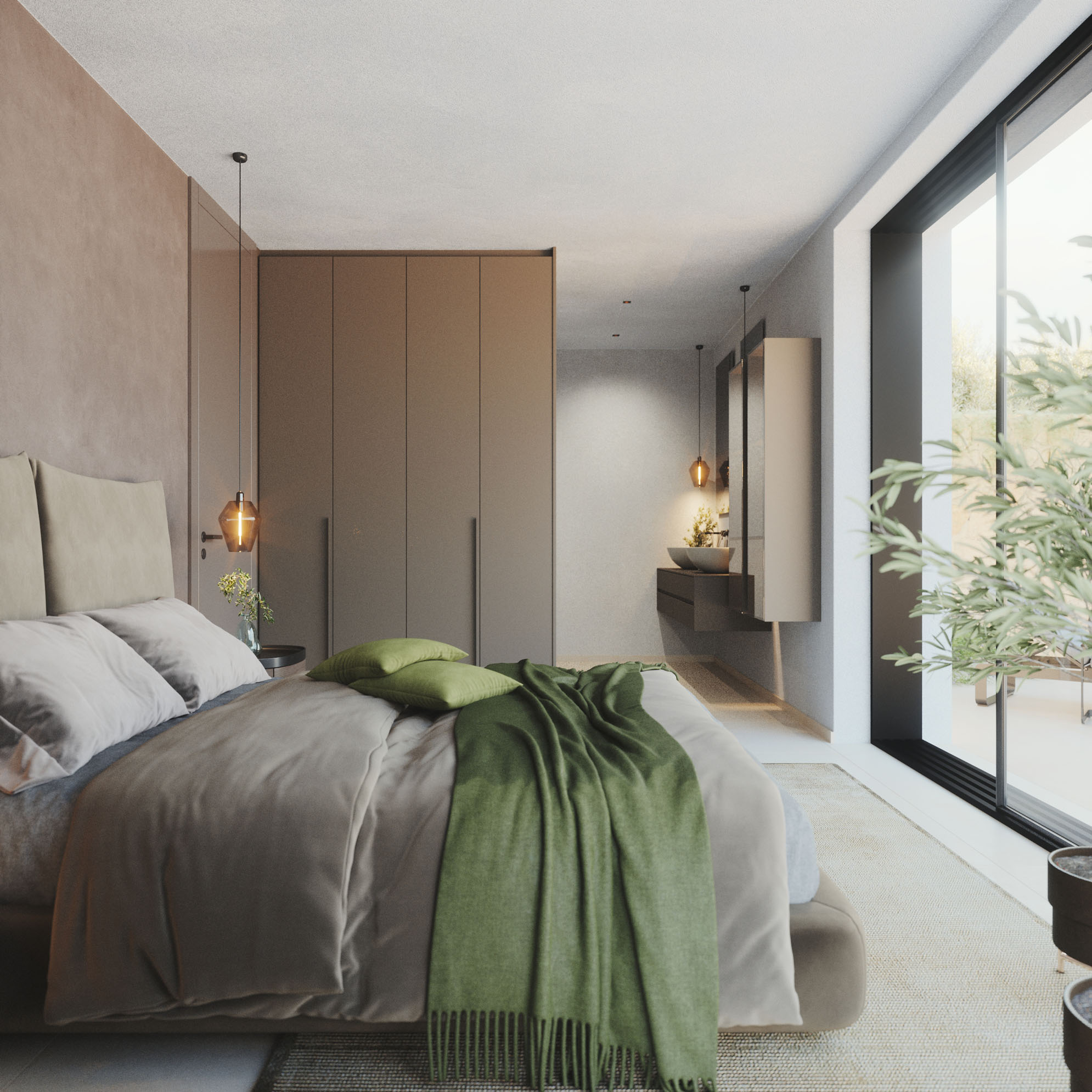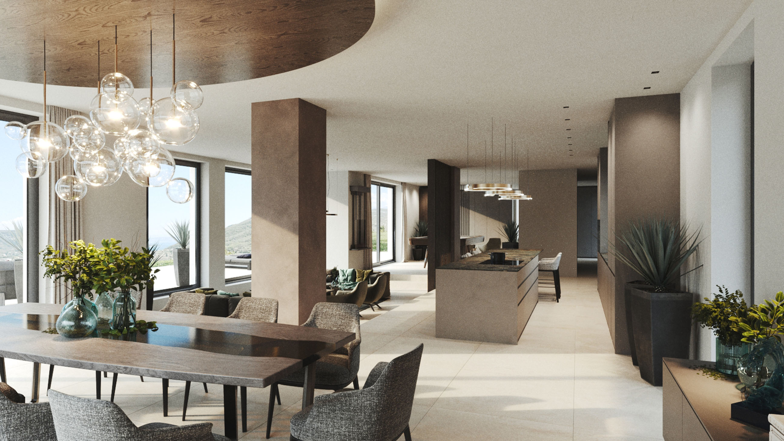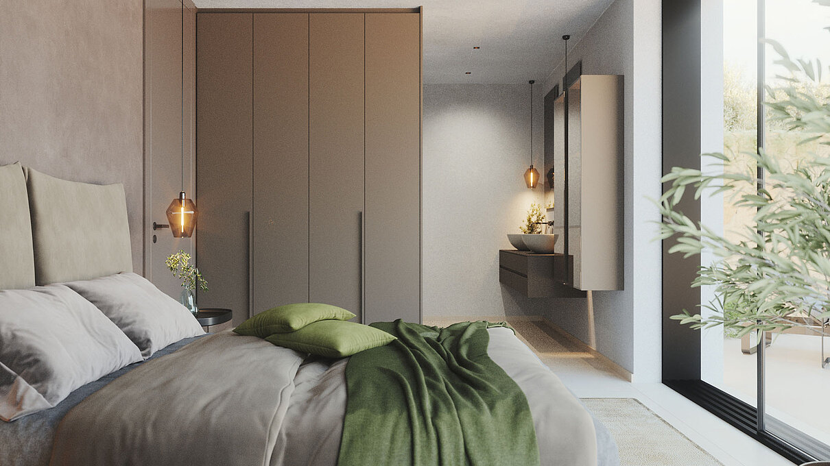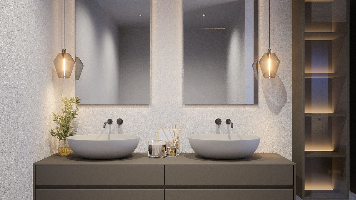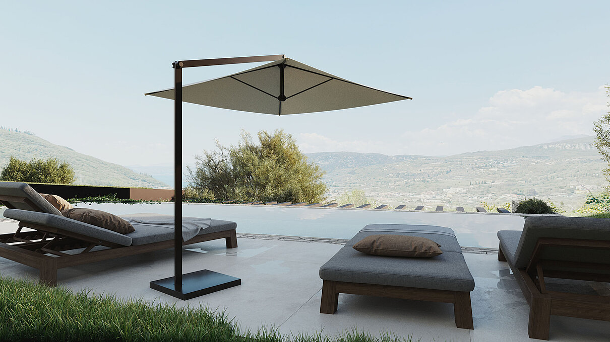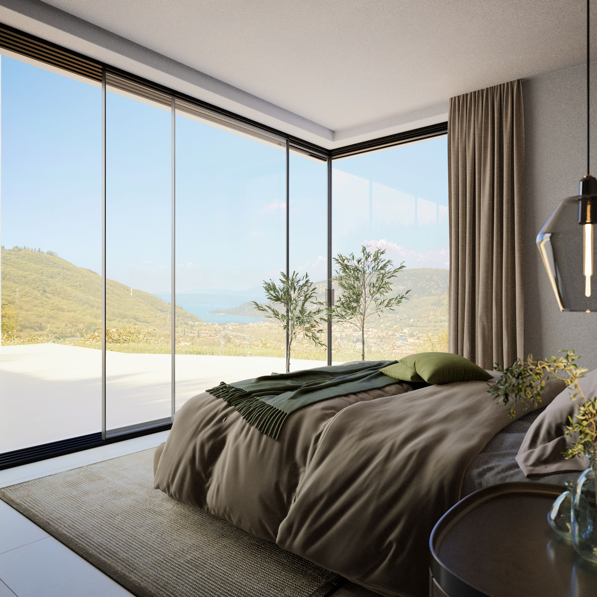 Le eleganti strutture si integrano armoniosamente nel paesaggio. I muri in pietra naturale tipici della zona esaltano il fascino mediterraneo dell'architettura moderna e senza tempo. Ampie superfici vetrate aprono gli spazi luminosi verso l'esterno e offrono una vista libera sul lago più bello d'Italia.
